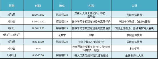 7月8日九大模块负责人将负责模块任务从实施路径、资金使用情况、保障措施、预期完成时间、预期绩效进一步明确,完成汇报PPT,学院领导班子集体审核把关、修改完善,为校级汇报做好准备。