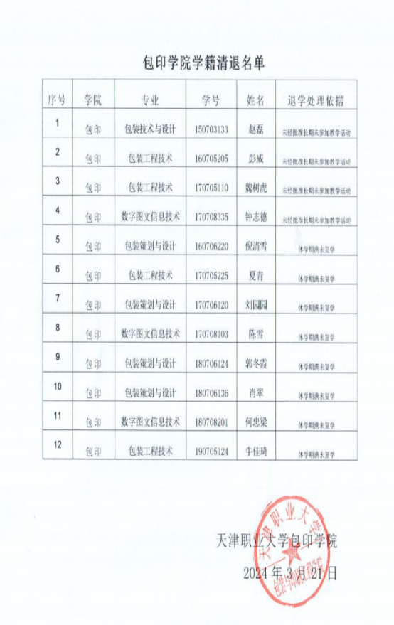 根据教育部《普通高校学生管理规定》(41号令)第三章第五节及《天津职业大学学生学籍管理办法》第六章第三十二条相关规定,倪清雪等8名同学休学期满未在学校规定期限内提出复学,赵磊等4名同学未经批准连续两周未参加学校规定的教学活动,我院拟对以上学生做退学处理,现予以公告,公告时间为2024年3月21日至2024年3月31日,请公告名单中未签收拟退学处理告知书的学生在公告期内至所属学院综合管理办公室领取,公告期满视为送达,学校将按规定注销其学籍。