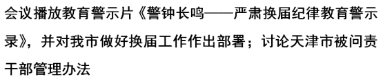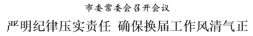 会议播放教育警示片《警钟长鸣──严肃换届纪律教育警示录》,并对做好我市区和乡镇领导班子换届工作提出要求。会议强调,换届是党和国家政治生活中的一件大事。当前,我市区和乡镇领导班子换届已经全面启动,要紧密结合党史学习教育,把做好换届工作作为学史力行的具体体现,切实提高政治判断力、政治领悟力、政治执行力,增强“四个意识”、坚定“四个自信”、做到“两个维护”,把纪律规矩这根弦绷得紧而又紧,克服麻痹思想,狠抓正风肃纪,保证换届选举依法有序。对于换届过程中的风险隐患,必须高度警醒,要坚持举一反三、引以为鉴,聚焦重点地区、关键人员和薄弱环节,加强对违反政治纪律、违反党管干部原则、违反组织人事纪律等方面问题隐患排查,及时纠偏纠错,切实把风险隐患消除在萌芽状态。要保持严的主基调,严格落实“十严禁”,以严的力度、严的氛围、严的标准、严的问责,坚决立起换届的“钢规铁律”,坚决铲除圈子文化、码头文化、山头主义等问题滋生土壤,使换届成为持续修复净化政治生态成果的有效体现。对拉票贿选、买官卖官、跑官要官、干扰换届等违规违纪问题坚决严肃查处,决不姑息、决不手软、决不搞下不为例,决不给“试错者”任何侥幸空间。要把坚持和加强党的领导贯穿换届全过程、各方面,全程领导、全程把关、全程监督,从市委做起、从市委常委同志做起,压实各级党组织主体责任和书记第一责任人责任,“一把手”要强化政治担当,敢抓敢管,旗帜鲜明抵制歪风邪气,坚决防范和整治不正之风,把严的工作力度层层传导到位,确保换届工作风清气正。